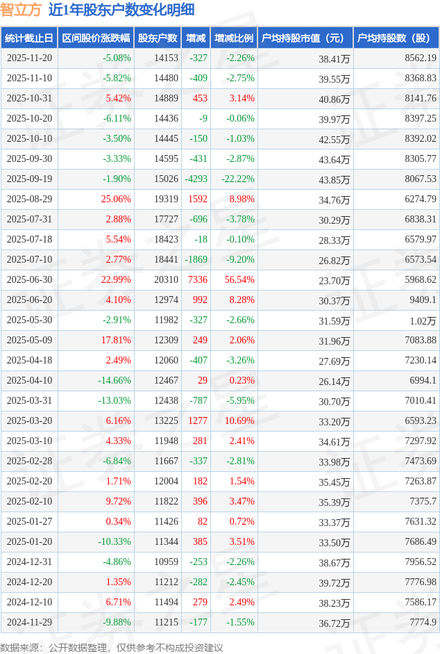 从股价来看,2025年11月10日至2025年11月20日,智立方区间跌幅为5.08%,在此期间股东户数减少327.0户,减幅为2.26%。
