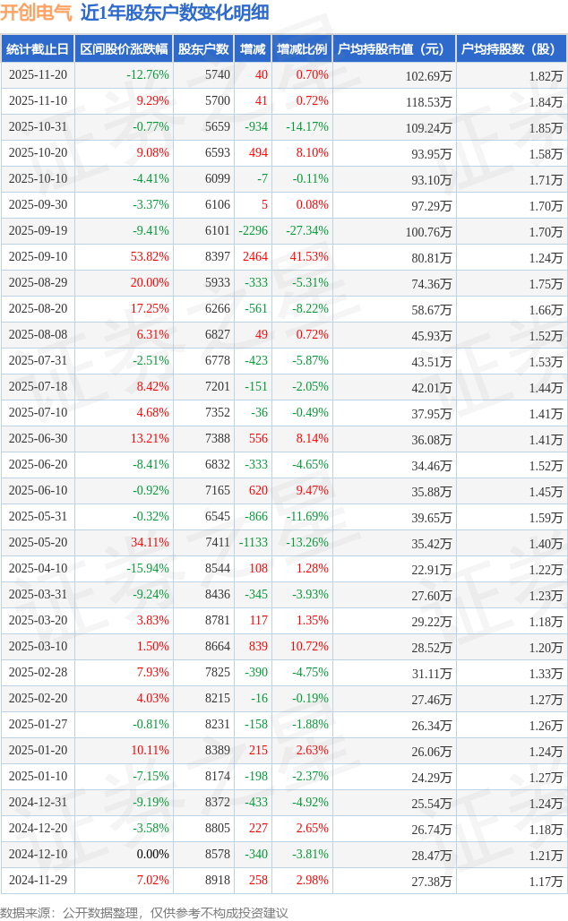 从股价来看,2025年11月10日至2025年11月20日,开创电气区间跌幅为12.76%,在此期间股东户数增加40.0户,增幅为0.7%。