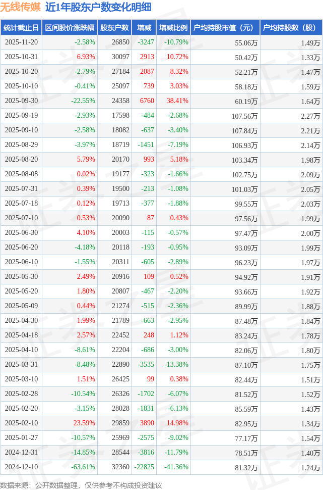 从股价来看,2025年10月31日至2025年11月20日,无线传媒区间跌幅为2.58%,在此期间股东户数减少3247.0户,减幅为10.79%。