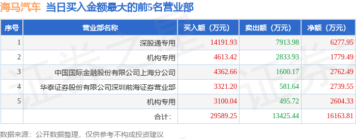 证券之星消息,沪深交易所2025年11月24日公布的交易公开信息显示,海马汽车(000572)因日跌幅偏离值达到7%的前5只证券登上龙虎榜。此次是近5个交易日内第2次上榜。