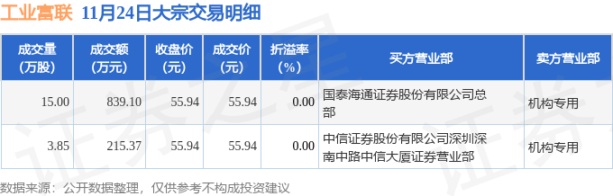 证券之星消息,11月24日工业富联发生大宗交易,交易数据如下: