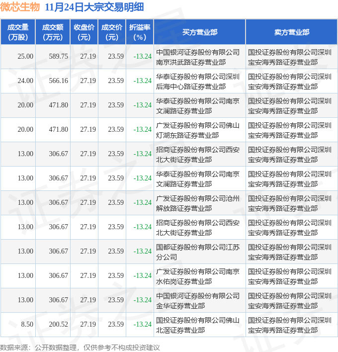 证券之星消息,11月24日微芯生物发生大宗交易,交易数据如下: