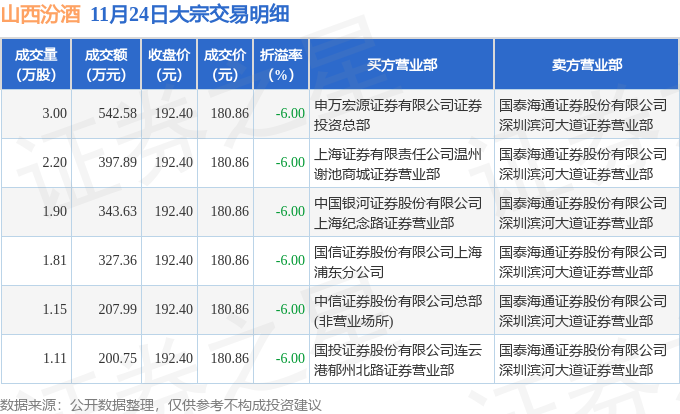 证券之星消息,11月24日山西汾酒发生大宗交易,交易数据如下: