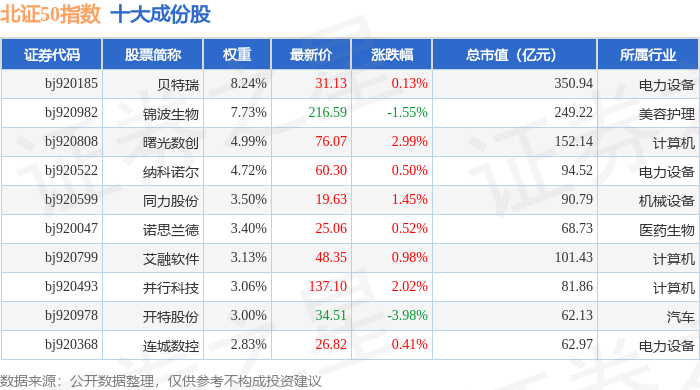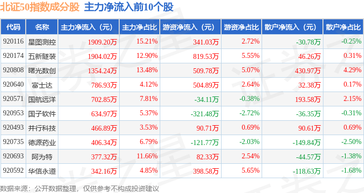 资金流向方面,北证50(899050)指数成份股当日主力资金净流入合计5054.71万元,游资资金净流出合计2776.21万元,散户资金净流出合计1008.77万元。成份股资金流向详情见下表: