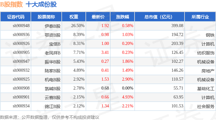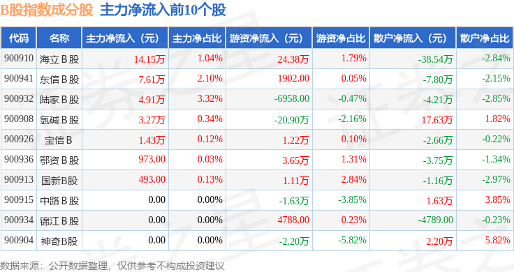 资金流向方面,B股指数(000003)成份股当日主力资金净流出合计50.55万元,游资资金净流出合计57.32万元,散户资金净流入合计107.87万元。成份股资金流向详情见下表: