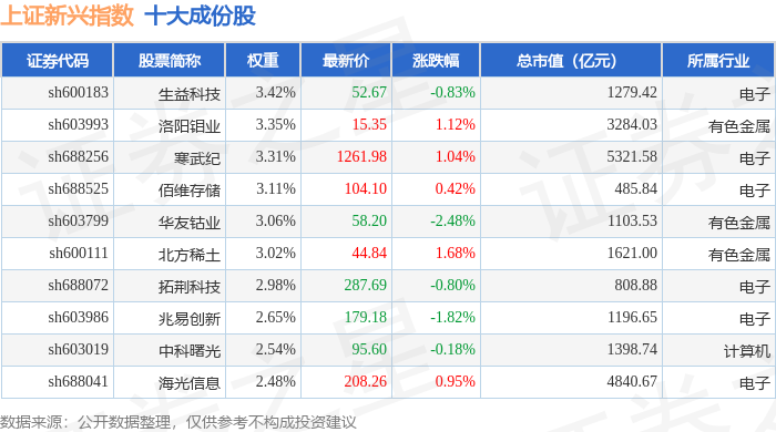 证券之星消息,11月24日,上证新兴(000067)指数报收于8374.51点,涨0.7%,成交974.78亿元,换手率1.02%。当日该指数成份股中,上涨的有33家,中航沈飞以5.7%的涨幅领涨,下跌的有16家,华友钴业以2.48%的跌幅领跌。