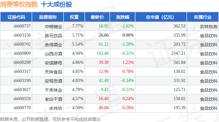 证券之星消息,11月24日,消费等权(000074)指数报收于7237.18点,跌0.25%,成交135.29亿元,换手率0.85%。当日该指数成份股中,上涨的有14家,神农集团以3.04%的涨幅领涨,下跌的有15家,梅花生物以2.31%的跌幅领跌。