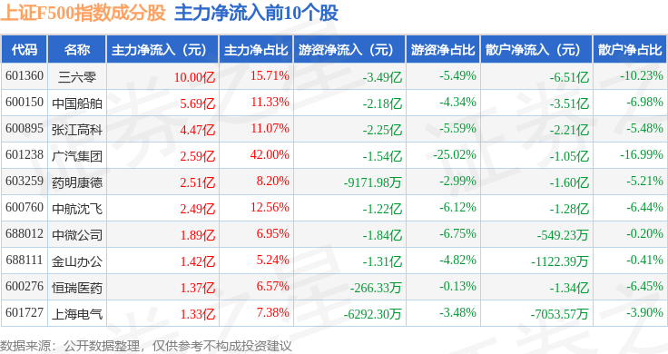 资金流向方面,上证F500(000100)指数成份股当日主力资金净流出合计37.36亿元,游资资金净流入合计2.87亿元,散户资金净流入合计34.49亿元。成份股资金流向详情见下表: