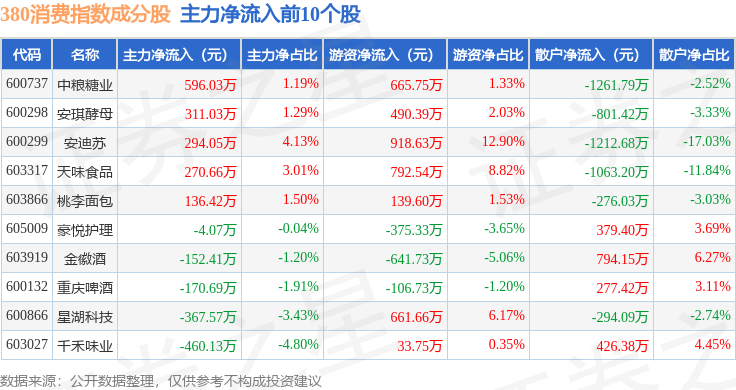 资金流向方面,380消费(000108)指数成份股当日主力资金净流出合计1.42亿元,游资资金净流入合计1985.65万元,散户资金净流入合计1.23亿元。成份股资金流向详情见下表: