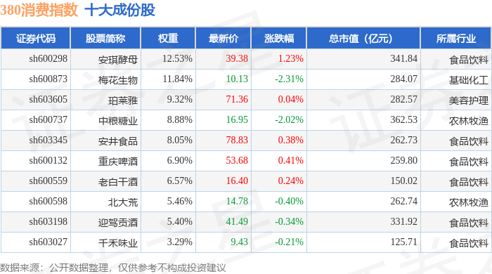 证券之星消息,11月24日,380消费(000108)指数报收于12206.31点,跌0.26%,成交39.51亿元,换手率1.14%。当日该指数成份股中,上涨的有9家,金徽酒以1.86%的涨幅领涨,下跌的有11家,梅花生物以2.31%的跌幅领跌。