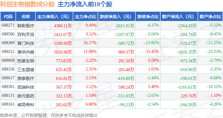资金流向方面,科创生物(000683)指数成份股当日主力资金净流出合计2.51亿元,游资资金净流入合计1263.42万元,散户资金净流入合计2.39亿元。成份股资金流向详情见下表: