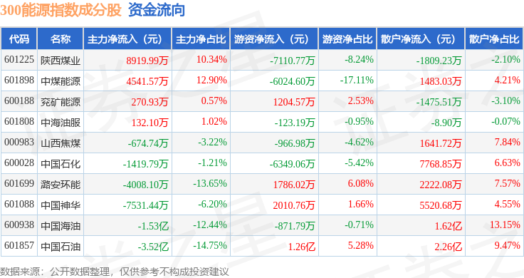 资金流向方面,300能源(000908)指数成份股当日主力资金净流出合计5.02亿元,游资资金净流出合计3864.46万元,散户资金净流入合计5.41亿元。成份股资金流向详情见下表: