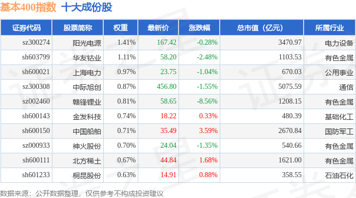 证券之星消息,11月24日,基本400(000966)指数报收于8418.81点,涨0.24%,成交2773.13亿元,换手率1.41%。当日该指数成份股中,上涨的有215家,蓝色光标以15.72%的涨幅领涨,下跌的有163家,赣锋锂业以8.56%的跌幅领跌。