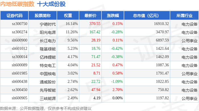 证券之星消息,11月24日,内地低碳(000977)指数报收于2048.96点,跌0.17%,成交669.89亿元,换手率0.95%。当日该指数成份股中,上涨的有19家,阿特斯以4.57%的涨幅领涨,下跌的有30家,恩捷股份以5.83%的跌幅领跌。