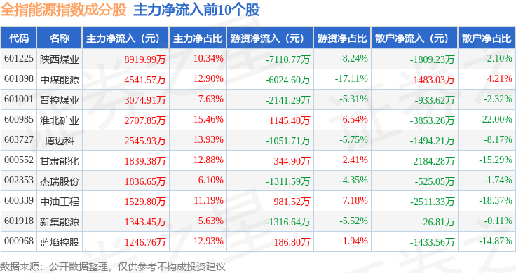 资金流向方面,全指能源(000986)指数成份股当日主力资金净流出合计6.29亿元,游资资金净流入合计1.03亿元,散户资金净流入合计5.26亿元。成份股资金流向详情见下表: