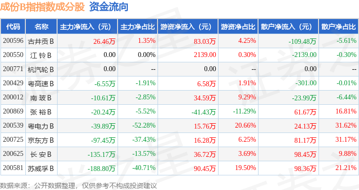 资金流向方面,成份B指(399003)指数成份股当日主力资金净流出合计472.25万元,游资资金净流入合计242.2万元,散户资金净流入合计230.06万元。成份股资金流向详情见下表:
