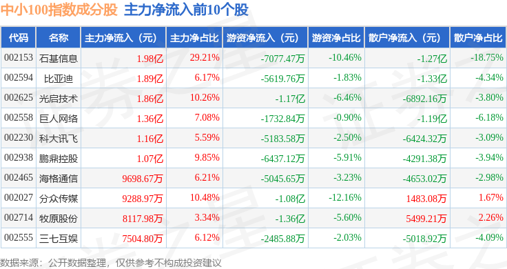 资金流向方面,中小100(399005)指数成份股当日主力资金净流出合计7.89亿元,游资资金净流出合计11.72亿元,散户资金净流入合计19.61亿元。成份股资金流向详情见下表: