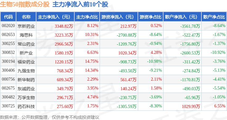 资金流向方面,生物50(399280)指数成份股当日主力资金净流出合计4.06亿元,游资资金净流出合计1446.29万元,散户资金净流入合计4.21亿元。成份股资金流向详情见下表: