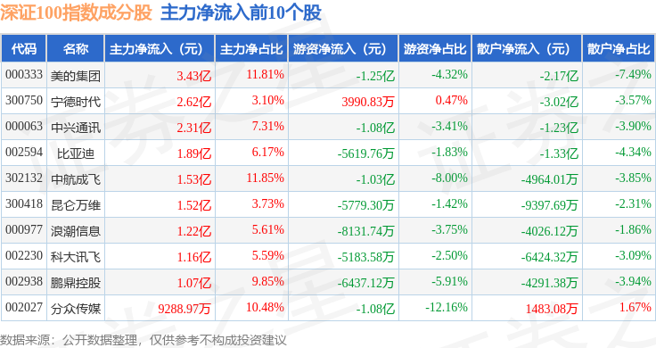 资金流向方面,深证100(399330)指数成份股当日主力资金净流出合计28.88亿元,游资资金净流入合计11.47亿元,散户资金净流入合计17.41亿元。成份股资金流向详情见下表: