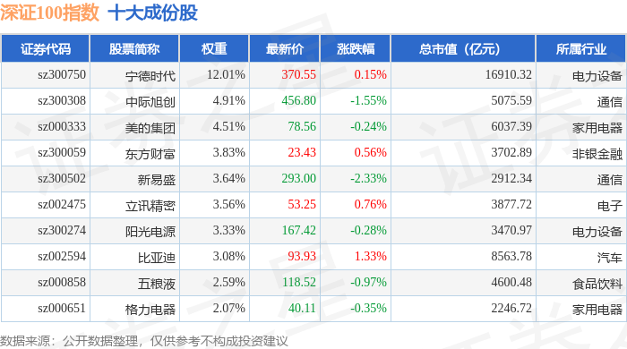 深证100(399330)指数十大成份股详情如下: