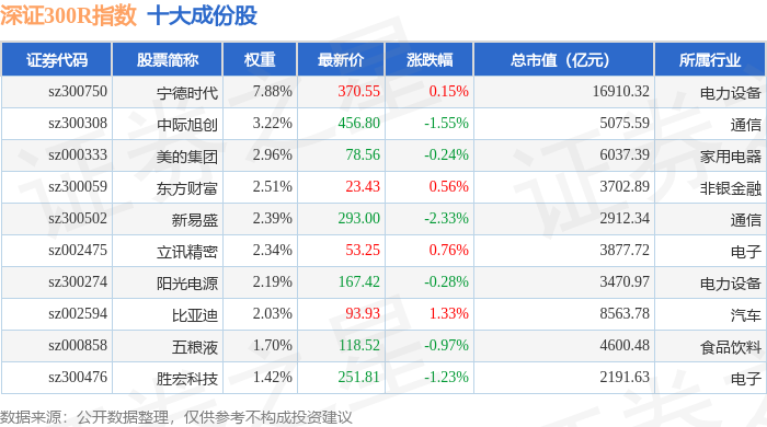 深证300R(399344)指数十大成份股详情如下:
