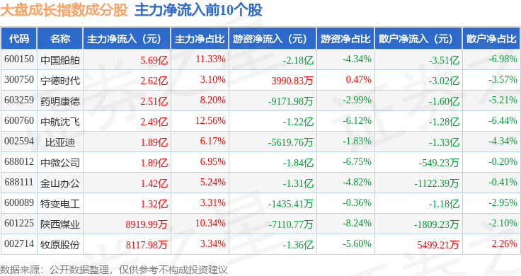 资金流向方面,大盘成长(399372)指数成份股当日主力资金净流出合计31.16亿元,游资资金净流入合计16.01亿元,散户资金净流入合计15.15亿元。成份股资金流向详情见下表: