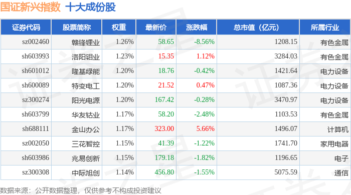 国证新兴(399392)指数十大成份股详情如下: