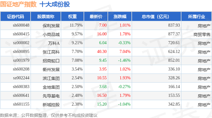 证券之星消息,11月24日,国证地产(399393)指数报收于3258.15点,涨0.62%,成交171.43亿元,换手率1.93%。当日该指数成份股中,上涨的有22家,张江高科以7.04%的涨幅领涨,下跌的有24家,合肥城建以10.0%的跌幅领跌。