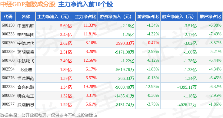 资金流向方面,中经GDP(399399)指数成份股当日主力资金净流出合计19.94亿元,游资资金净流入合计4.59亿元,散户资金净流入合计15.35亿元。成份股资金流向详情见下表: