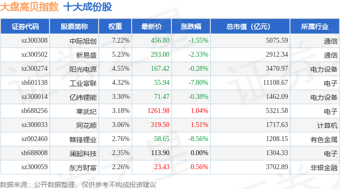 大盘高贝(399405)指数十大成份股详情如下: