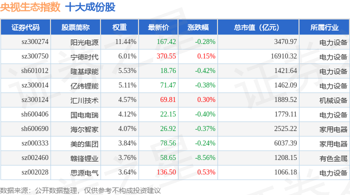 央视生态(399556)指数十大成份股详情如下: