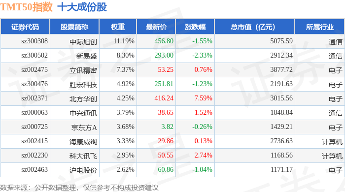 证券之星消息,11月24日,TMT50(399610)指数报收于8378.53点,涨0.4%,成交1177.62亿元,换手率1.53%。当日该指数成份股中,上涨的有36家,北方华创以7.59%的涨幅领涨,下跌的有13家,润和软件以6.12%的跌幅领跌。