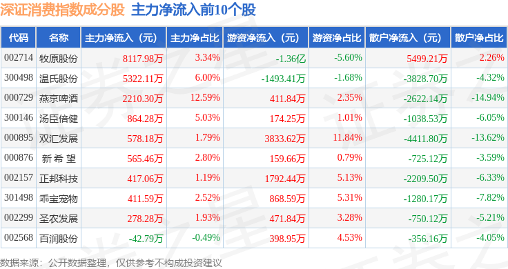 资金流向方面,深证消费(399617)指数成份股当日主力资金净流出合计2.34亿元,游资资金净流入合计7892.31万元,散户资金净流入合计1.55亿元。成份股资金流向详情见下表: