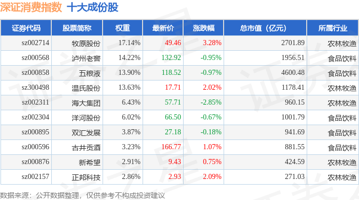 证券之星消息,11月24日,深证消费(399617)指数报收于9724.79点,涨0.4%,成交113.88亿元,换手率1.05%。当日该指数成份股中,上涨的有11家,牧原股份以3.28%的涨幅领涨,下跌的有8家,海大集团以2.85%的跌幅领跌。