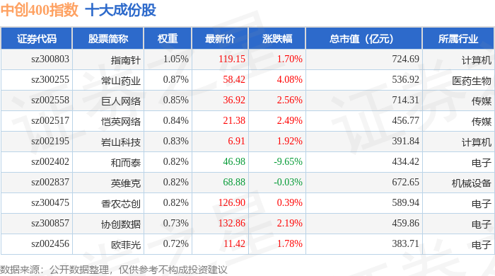 证券之星消息,11月24日,中创400(399624)指数报收于2384.01点,涨1.37%,成交2374.14亿元,换手率2.98%。当日该指数成份股中,上涨的有321家,蓝色光标以15.72%的涨幅领涨,下跌的有73家,盛新锂能以9.99%的跌幅领跌。