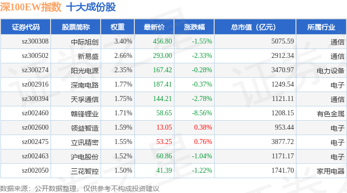 证券之星消息,11月24日,深100EW(399632)指数报收于4912.81点,跌0.04%,成交1773.51亿元,换手率0.96%。当日该指数成份股中,上涨的有56家,北方华创以7.59%的涨幅领涨,下跌的有43家,赣锋锂业以8.56%的跌幅领跌。