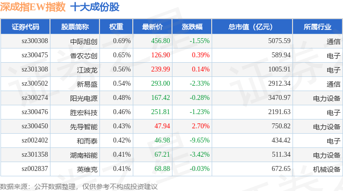 证券之星消息,11月24日,深成指EW(399659)指数报收于4403.49点,涨0.47%,成交4475.61亿元,换手率1.7%。当日该指数成份股中,上涨的有336家,蓝色光标以15.72%的涨幅领涨,下跌的有154家,国城矿业以10.0%的跌幅领跌。