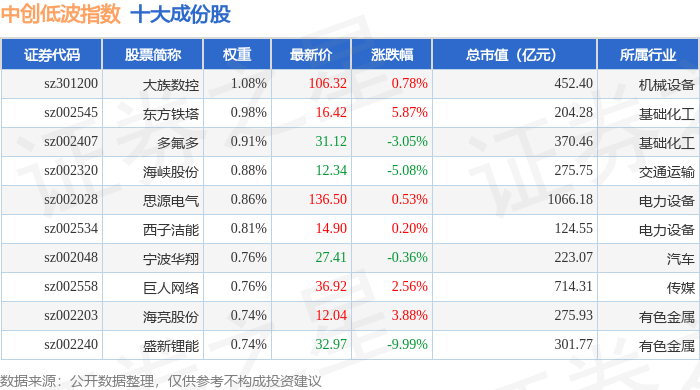 证券之星消息,11月24日,中创低波(399665)指数报收于2259.72点,涨0.31%,成交1092.98亿元,换手率1.35%。当日该指数成份股中,上涨的有140家,北方华创以7.59%的涨幅领涨,下跌的有54家,盛新锂能以9.99%的跌幅领跌。