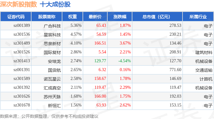 深次新股(399678)指数十大成份股详情如下: