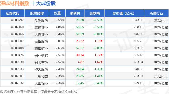 证券之星消息,11月24日,深成材料(399681)指数报收于1151.13点,跌1.49%,成交664.96亿元,换手率1.6%。当日该指数成份股中,上涨的有39家,四川双马以4.27%的涨幅领涨,下跌的有38家,国城矿业以10.0%的跌幅领跌。