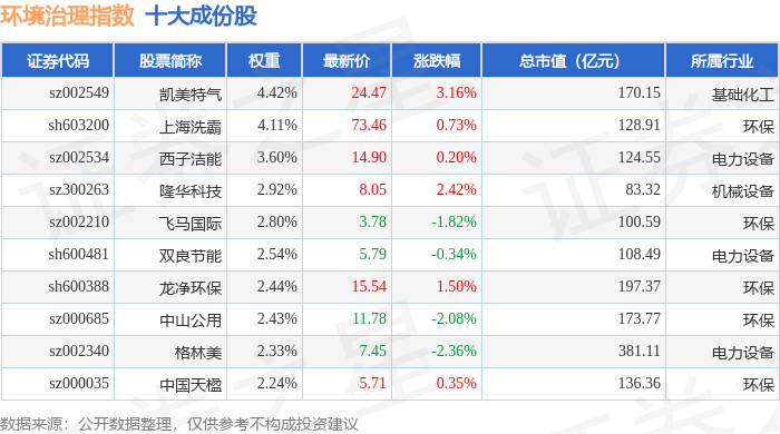 证券之星消息,11月24日,环境治理(399806)指数报收于1370.6点,涨0.11%,成交153.98亿元,换手率2.19%。当日该指数成份股中,上涨的有25家,聚光科技以3.54%的涨幅领涨,下跌的有22家,川能动力以7.11%的跌幅领跌。