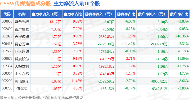 资金流向方面,CSSW传媒(399810)指数成份股当日主力资金净流入合计29.04亿元,游资资金净流出合计11.85亿元,散户资金净流出合计17.19亿元。成份股资金流向详情见下表: