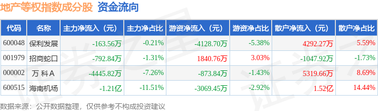 资金流向方面,地产等权(399983)指数成份股当日主力资金净流出合计1.75亿元,游资资金净流出合计6231.23万元,散户资金净流入合计2.37亿元。成份股资金流向详情见下表: