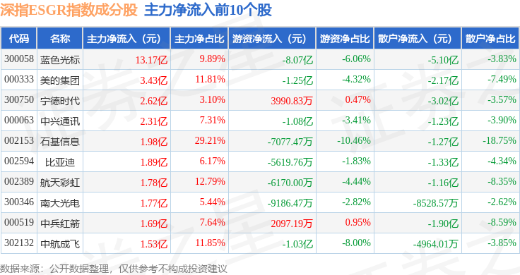 资金流向方面,深指ESGR(470026)指数成份股当日主力资金净流出合计55.08亿元,游资资金净流入合计2004.4万元,散户资金净流入合计54.88亿元。成份股资金流向详情见下表:
