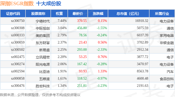证券之星消息,11月24日,深指ESGR(470026)指数报收于18015.83点,涨0.31%,成交3801.29亿元,换手率1.56%。当日该指数成份股中,上涨的有266家,蓝色光标以15.72%的涨幅领涨,下跌的有125家,大中矿业以10.0%的跌幅领跌。