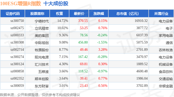 资金流向方面,100ESG增强R(470033)指数成份股当日主力资金净流出合计9.77亿元,游资资金净流入合计9.92亿元,散户资金净流出合计1466.99万元。成份股资金流向详情见下表: