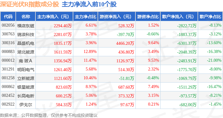 资金流向方面,深证光伏R(470035)指数成份股当日主力资金净流出合计9.17亿元,游资资金净流入合计5.67亿元,散户资金净流入合计3.5亿元。成份股资金流向详情见下表: