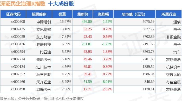证券之星消息,11月24日,深证民企治理R(470058)指数报收于2012.33点,跌0.2%,成交947.42亿元,换手率1.63%。当日该指数成份股中,上涨的有32家,牧原股份以3.28%的涨幅领涨,下跌的有17家,天齐锂业以8.01%的跌幅领跌。
