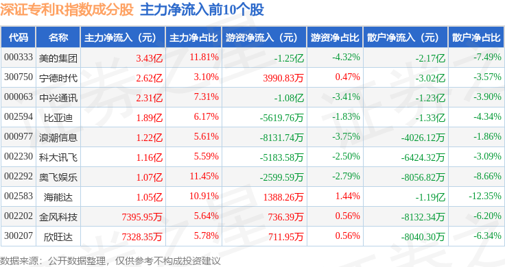 资金流向方面,深证专利R(470067)指数成份股当日主力资金净流入合计14.21亿元,游资资金净流出合计7.14亿元,散户资金净流出合计7.07亿元。成份股资金流向详情见下表: