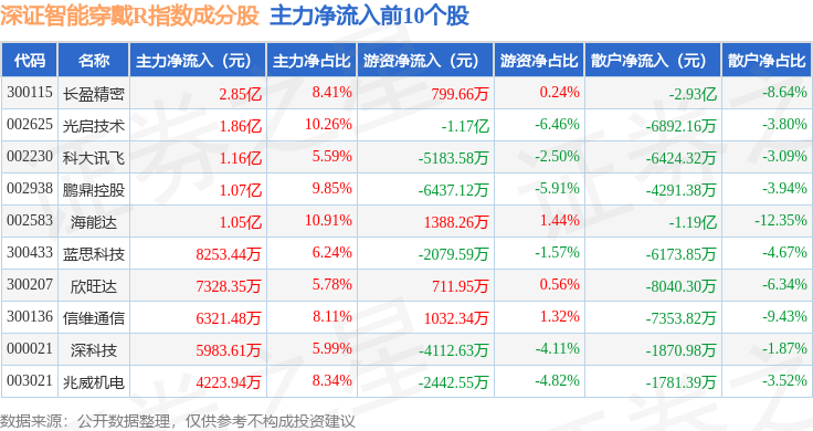 资金流向方面,深证智能穿戴R(470074)指数成份股当日主力资金净流入合计7.26亿元,游资资金净流出合计5.62亿元,散户资金净流出合计1.64亿元。成份股资金流向详情见下表: